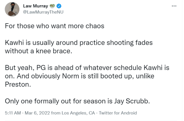 快船记者Law Murray报道,莱昂纳德在今日的投篮训练中并未佩戴护膝,而此前他参加训练都得戴护膝。对于小卡来说,这也是康复的一大进展。目前的乔治的复出时间表依旧早于小卡,此前有报道称,小卡有望在季后赛期间复出。两人现在的状态都不错,一旦快船打进季后赛,乔治和小卡能够携手出战,他们的提升是毋庸置疑的。