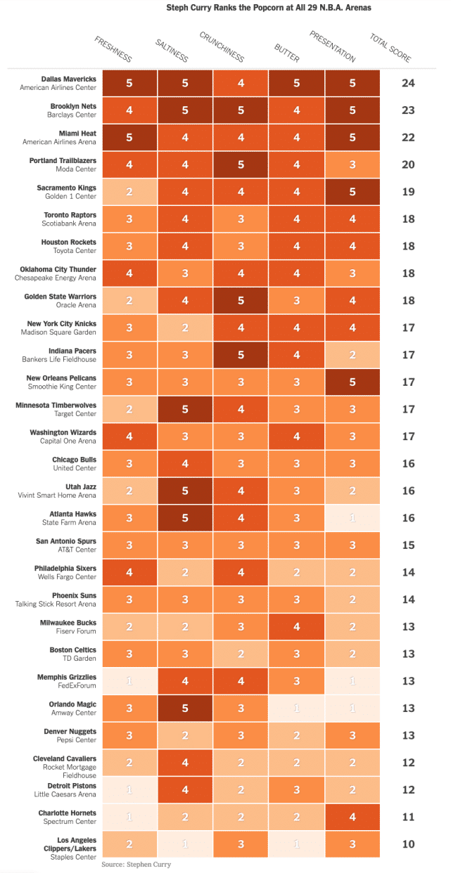 很多球迷都知道库里对爆米花很痴迷,他甚至在一档节目中对30支球队主场的爆米花进行过排名,而且是分五个维度进行打分。这5个维度,分别是新鲜度、咸香度、口感、奶油味和包装,各项满分是5分。