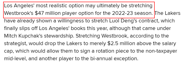 其二,也是湖人最现实的做法,就是买断并也延期支付威少最后一年4700万美元的合同,就像当初处理洛尔-邓的合同那样。当然,这样一来,威少就会在未来几年影响湖人的薪金空间。