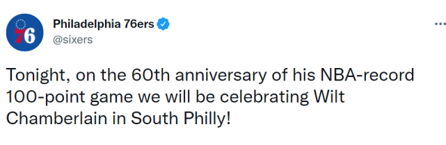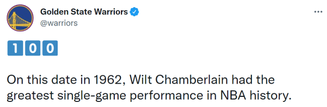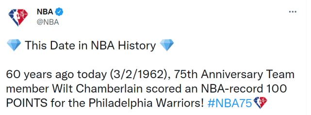 NBA官方写道:“60年前的今天,75大球星阵容中的张伯伦为费城勇士拿下100分,创NBA得分纪录。”勇士官方也晒出了张伯伦的单场100分表现,76人官方则写道:“我们今天要庆祝张伯伦100分的60周年!”NBA数据晒出了张伯伦100分的具体表现:63投36中,罚球32罚28中,出战48分钟,得到100分25篮板!