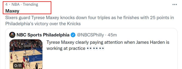 来源:24直播网03-03 20:2524直播网3月03日讯 ,76人123-108击败尼克斯,完成16分大逆转。马克西得到25分4篮板3助攻,连续3场比赛得分20+,这也追平了他个人生涯连续20+的场数纪录。上下半场,马克西的表现判若两人,上半场,他只得到4分,而下半场,马克西得到21分,第三节11分,第四节10分。赛后,他第一时间冲上全美热搜,热度甚至高于哈登和恩比德!