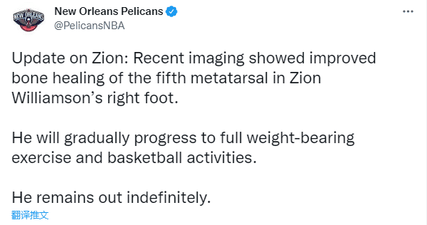 鹈鹕官方今日更新了锡安的伤情恢复进度,最新扫描检查结果显示锡安的右脚第五跖骨伤势愈合已有好转,他将逐步开始完整负重训练和篮球活动,目前他的状态仍为无限期缺战。
