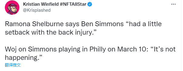 Brian Windhorst报道,西蒙斯有可能无法在三月复出。