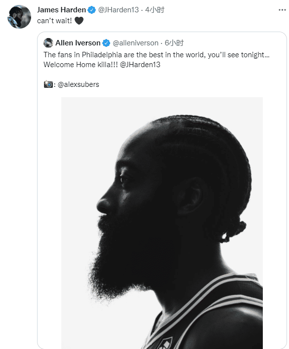 76人名宿艾弗森为哈登主场首秀发声,晒出哈登侧面照,配文:费城球迷是世界上最好的球迷,你们今晚就会看到……欢迎杀手回家!