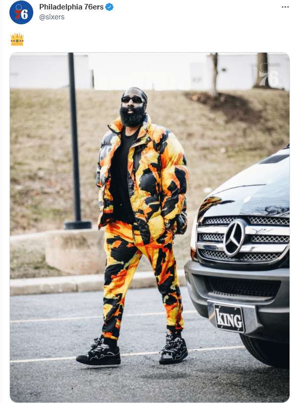 哈登双手抄兜炫酷亮相!76人主场首秀门票售罄,官方晒照配王冠表情