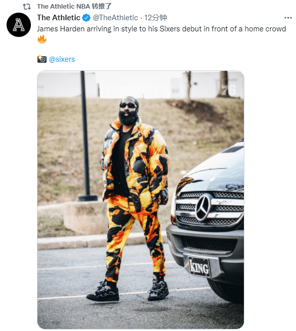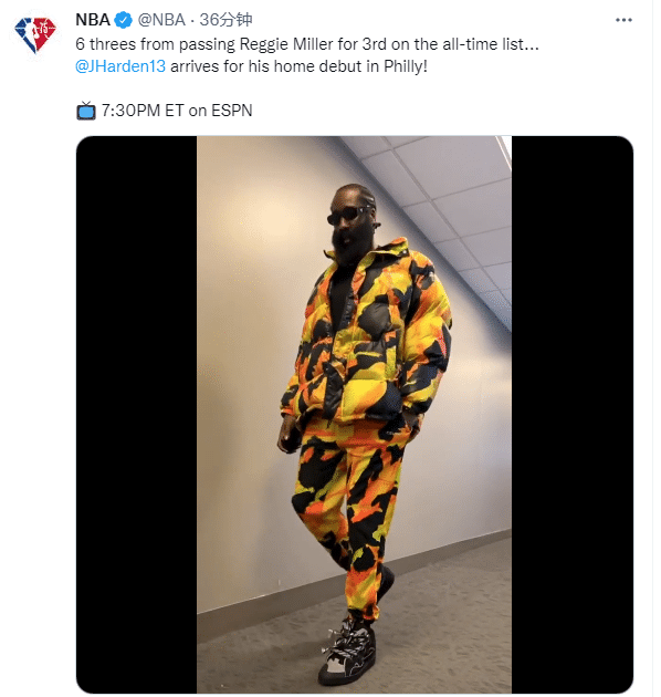 NBA官推晒出了哈登入场穿搭并配文:还差6个三分超过雷吉-米勒,登上历史三分榜第三!费城主场首秀!美媒TA转发哈登入场照,发推写到:詹姆斯·哈登以炫酷的风格在主场球迷面前亮相并迎来76人主场首秀。