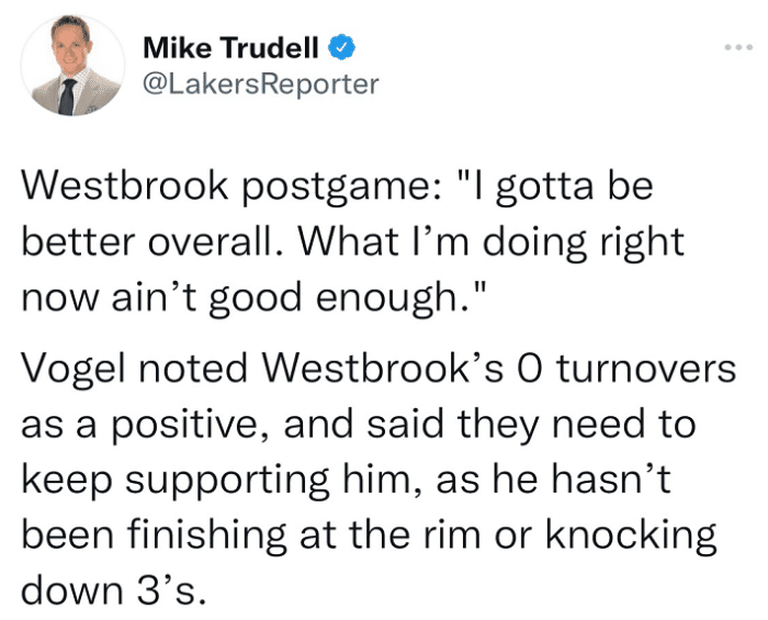 湖人主帅沃格尔谈到威少表示:威少0次失误是一个积极的信号,他们还要继续支持他。因为他还没有在篮下完成投篮或者命中3分。