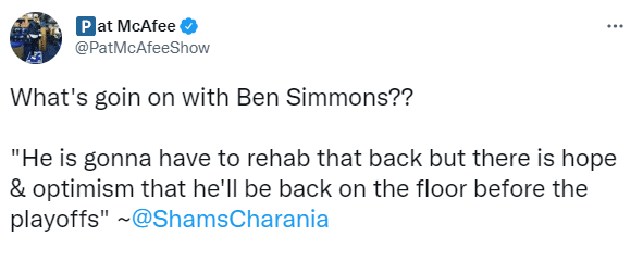 由于遭遇背部酸痛,西蒙斯暂时停止恢复训练,不过纳什表示西蒙斯的背伤不严重,只是重返赛场必经的过程;确实,西蒙斯已经长达8个多月没有打过NBA比赛,他需要更多的时间来找状态以及适应赛场。