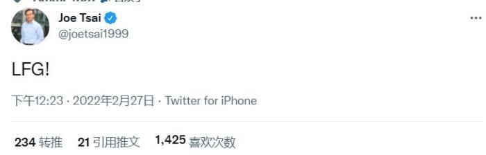 蔡崇信发推庆祝胜利,写道:“LFG!(Let's f— go!即让我们TMD去吧!海外社交媒体常用的鼓励短语)