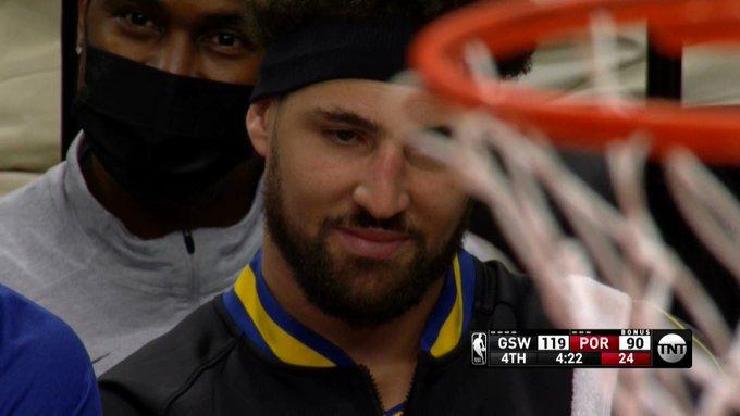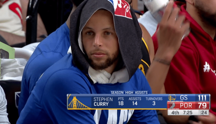 末节库里不再上场,比赛早早沦为练兵的垃圾时间,最终勇士客场大胜开拓者;库里身穿蓝色长袖T恤,头上包着毛巾,面带微笑观战,提前打卡太轻松。