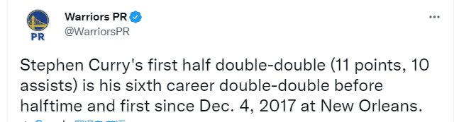 第二、库里职业生涯第6次半场得分和助攻都上双,17年12月5日后首次做到