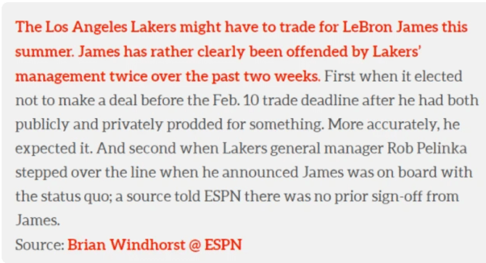 如今,湖人要为了季后赛而战,交易颗粒无收,补强接连遇阻的情况下,湖人的前景并不被看好,詹姆斯和湖人管理层的矛盾也被多次爆出。甚至有美国记者列出交易方案,湖人可以在夏天送走詹姆斯。