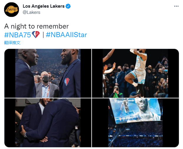 湖人官方也回顾克利夫兰全明星赛,晒出詹姆斯和乔丹寒暄、詹姆斯拥抱安东尼、詹姆斯绝杀以及科比出现在大屏幕的画面,配文写道:值得铭记的一晚。