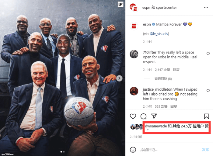 科比C位!詹姆斯转发75大球星湖人版合照:曼巴永恒,名字永远传承