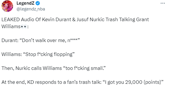 据唇语专家解读,冲突之后杜兰特指着格威说:别从我身上跨过去,Nxxxx;格威:TMD别假摔了;努尔基奇喷格威:TMD,软蛋。