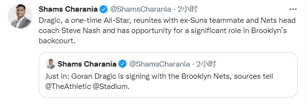35岁德拉季奇决定加盟篮网,据之前报道,篮网主帅纳什亲自出面招募德拉季奇;此前德拉季奇曾在太阳队给纳什打过替补,为纳什替补打过190场比赛,他与纳什的经纪人为同一人。