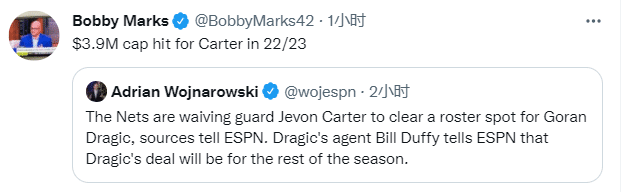 篮网为了签约德拉季奇,他们将裁掉杰文-卡特,为即将签约球队的德拉季奇腾出位置;本赛季杰文-卡特为篮网出战46场,场均能够贡献3.6分1.5篮板1.0助攻;