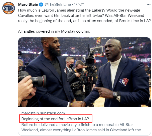 来源:24直播网02-22 11:3424直播网02月22日讯 ,克利夫兰全明星周末已经结束了,但关于詹姆斯可能离开湖人的争议言论依旧在;名记Marc Stein撰文并发推写道:勒布朗-詹姆斯在多大程度上疏远湖人?在他两次离开后,新时代骑士会想要他回来吗?全明星周末真的像人们经常听到的那样,是勒布朗湖人生涯终结的开始吗?