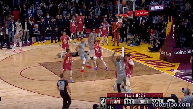 这场比赛最后时刻一波三折,进入到末节之前,库里所在的詹姆斯队落后1分,不过最后阶段詹姆斯队连续得分,拉文的三分球让杜兰特队看到了赢球的希望。因为当时的目标分是163分,而詹姆斯队161分,杜兰特队已经160分,双方都差一个球。