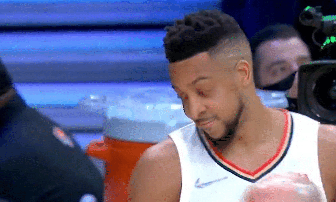 麦科勒姆第一个点右侧底角5中3,右侧弧顶5中3的同时还命中2分的花球,弧顶处的点连续命中。超远三分两个都没有命中,最后一个点连续打铁,麦科勒姆得到19分。