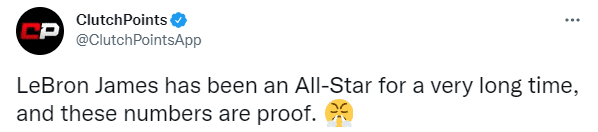 据美媒ClutchPoints统计,湖人球星詹姆斯生涯至今共出战全明星531分钟,而杜兰特队所有队友加起来共计出战271分钟,美媒发推写道:勒布朗-詹姆斯已经成为全明星很长一段时间了,这些数据就是证明。