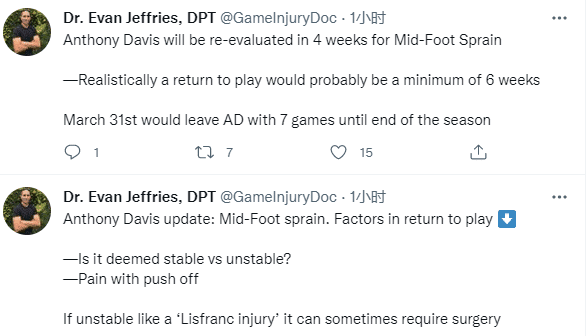 医学专家Evan Jeffries发推写道浓眉中足扭伤,重返赛场时脚踝是否稳定,移动是否有痛感;若中足跖跗关节(Lisfranc关节)损失, 可能需要接受手术;该专家还表示实际上,中足扭伤比普通的脚踝扭伤更严重,浓眉复出可能至少需要6周,等到他复出距离赛季结束还剩7场比赛。