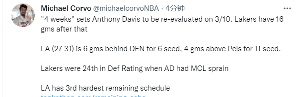 医学运动专家Jeff Stotts发推写道,浓眉中足扭伤,平均缺席28天休战12场比赛,中足扭伤比脚踝外翻扭伤更成问题,尤其是涉及到跖跗关节区域的情况下;湖人队已经表示重新评估前缺席四周,如果他缺席很久,我不会感到惊讶。
