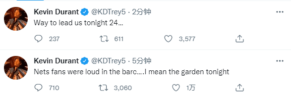 篮网逆转赢球赛后,杜兰特连续发推庆祝,先是发推写道:篮网球迷们在巴克莱中心很闹腾啊,哦,我的意思是今晚在麦迪逊花园球馆;然后杜兰特又发推:这就是今晚24号带领我们的方式(24号代指篮网新秀托马斯)。