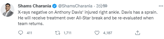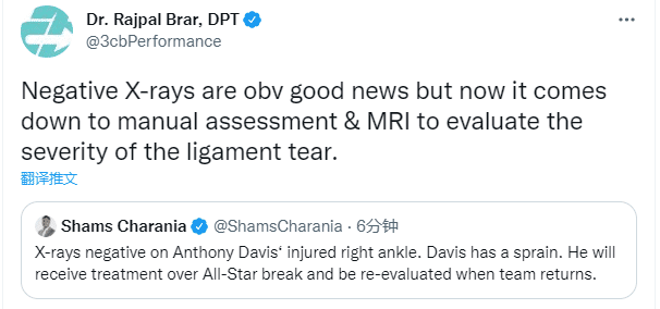 所幸浓眉的脚踝没有骨折,医学专家Rajpal Brar发推写道,X光呈阴性是好消息,现在浓眉将接受MRI(核磁共振)来评估韧带撕裂的严重程度。