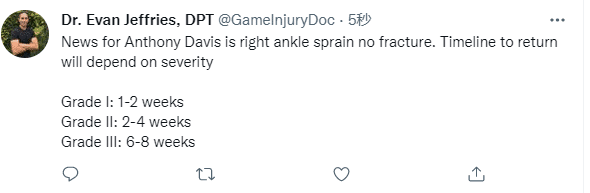 对于浓眉受伤一幕,医学专家evan Jeffries发推分析,浓眉脚踝90度扭伤不太好,可能是脚踝骨折或者脱臼,希望仅仅只是扭伤;医学专家详解伤情,一级扭伤伤停1-2周,二级扭伤伤停2-4周,三级扭伤伤停6-8周。