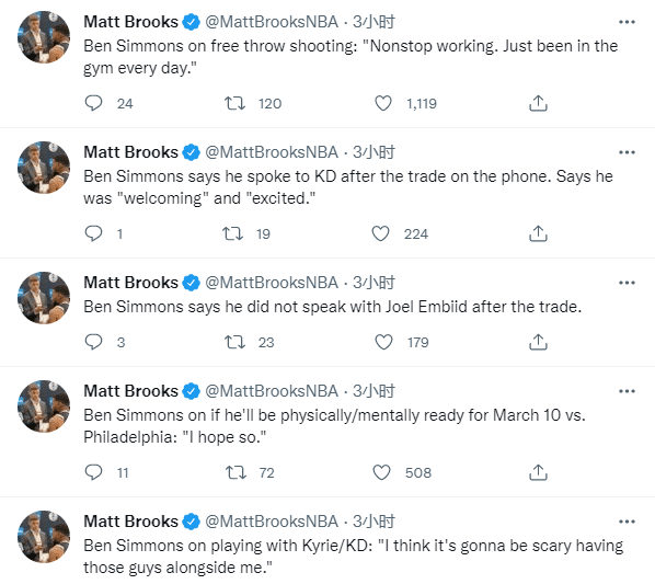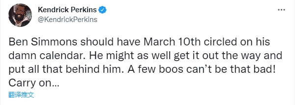 西蒙斯还表示目前还没有首秀的具体日期,但他已经开始加快速度了;西蒙斯本人希望能够出战3月11日对阵76人的比赛,对此名嘴帕金斯发推写道:本-西蒙斯应该把3月11号这一天在日历上圈出来,他应该大干一场,把所有问题甩到身后,客场的一些嘘声没那么遭的。