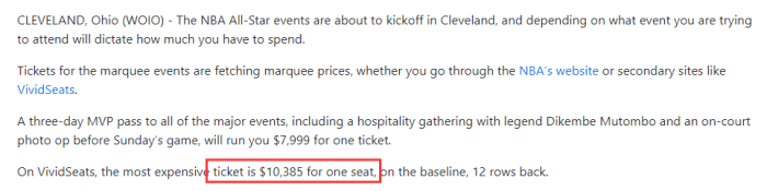 来源:24直播网02-16 15:2224直播网02月16日讯 ,据克利夫兰当地媒体cleveland19.com报道,本赛季全明星正赛的最高票价已超过10000美元,其他各阶段赛事的最低票价也曝光了。