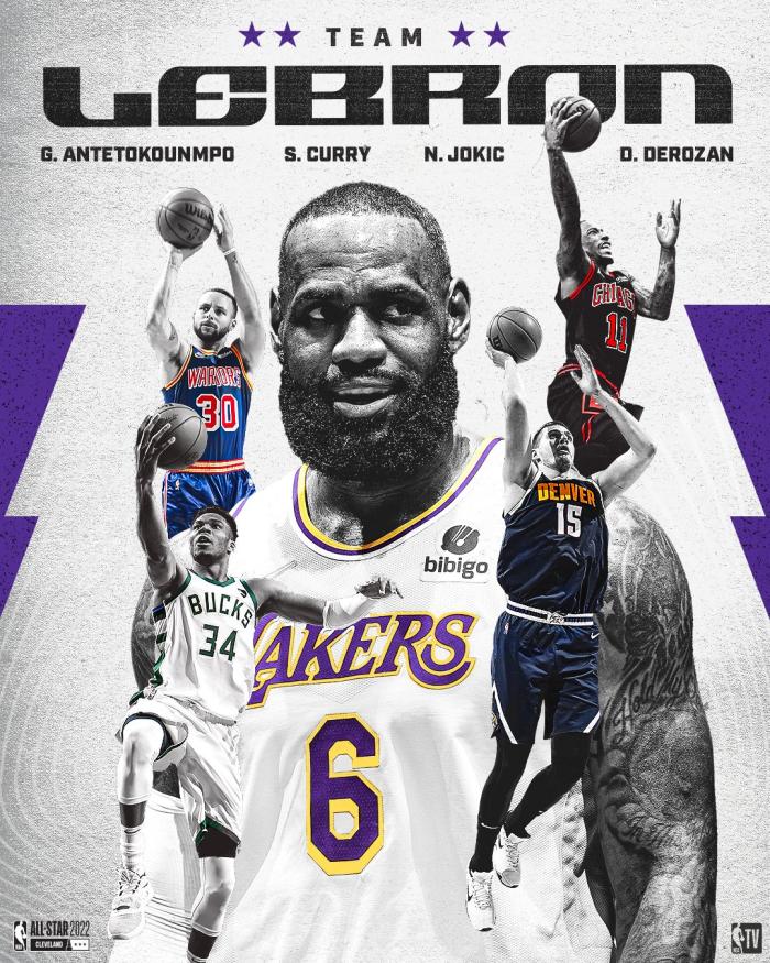 今年全明星赛,詹姆斯队球星分别是詹姆斯(队长)、字母哥、库里、德罗赞、约基奇;替补球星是东契奇、加兰、保罗、巴特勒、米切尔、范乔丹、骑士阿伦(顶替哈登)