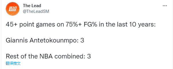 第五、字母哥三次得分45+且罚球命中率至少75联盟成过去10年联盟第一人,其他人加起来总共3次做到。