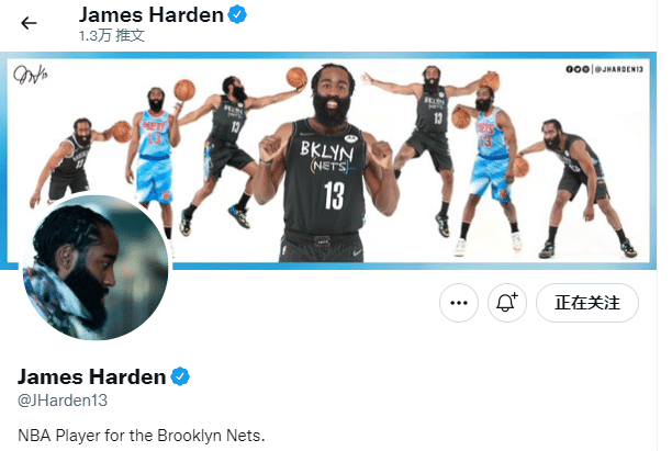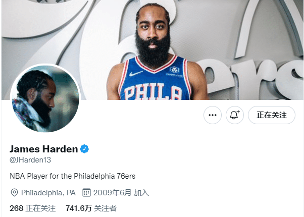 哈登已经把此前与篮网有关的内容换掉,把推特banner图换成自己身穿76人战袍并且站在76人logo前的照片,并且把个人简介改成76人球员,相当于用这样的方式向篮网说再见。