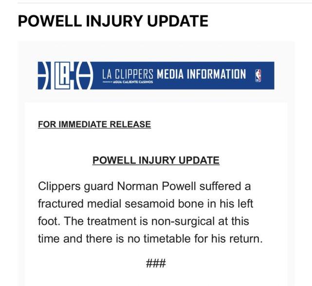 鲍威尔是在2月11日对独行侠一战的第三节中受伤的,当时他突破上篮后,摔出底线,随后一瘸一拐地离开了球场。