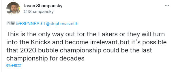 有球迷赞同美国杨毅的观点,发推表示:这是湖人唯一的出路,否则他们会变成尼克斯,变得无关紧要,2020年的总冠军可能是他们未来几十年的最后一个总冠军。