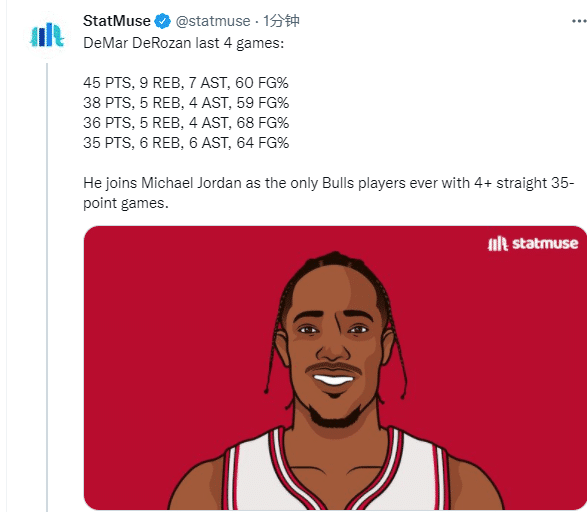 据美媒StatMuse统计,德罗赞已经连续第四场比赛单场得到35分,成为公牛队史第二位达成该成就的球员;上一位公牛球员是迈克尔-乔丹,他在1996年达成该成就;德罗赞成为96年乔丹之后公牛队史第一位连续4场35+的球员。