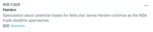 名记曝哈登明确表态并且迫切希望被交易,篮网交易哈登的报价也随之曝光,目前哈登换西蒙斯的交易流言已经冲上推特热搜榜引发热议;不过espn另一名记沃纳罗斯基表示篮网和76人之间没有进行任何的谈判。