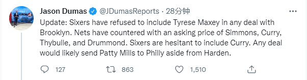 据费城记者Jason Dumas报道,费城拒绝把马克西加入哈登交易之后,篮网重新向76人报价,索要西蒙斯、塞布尔、小库里和德拉蒙德,费城另一记者Keith Pompey报道,篮网另一个要价是向76人索要西蒙斯、塞布尔、小库里和首轮选秀权。
