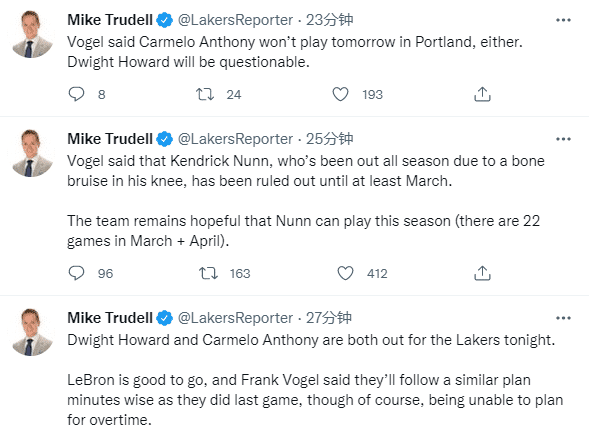 来源:24直播网02-09 12:2224直播网02月09日讯 ,湖人主场对阵雄鹿赛前,沃格尔透露安东尼(右腿筋拉伤)和霍华德(下背部紧张)因伤缺席本场比赛,詹姆斯会继续出战;沃帅还透露纳恩因伤继续休战,3月份之前不会复出,而且没有具体的复出时间表。
