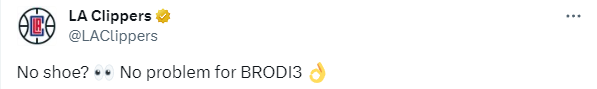 快船官方晒威少单脚穿鞋三分,写道:没有鞋?对于威少来说也没问题。