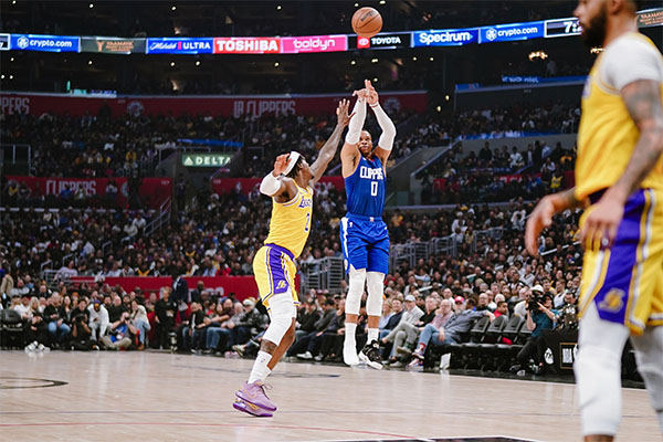 洛城德比备受关注,詹姆斯因脚踝伤势而休战,快船和湖人第一节打得十分精彩,威少仍旧替补上场,第一节最后30多秒,威少边运球边提鞋,半天没穿上,之后干脆把鞋踢到场边,威少单脚穿鞋并且迎着范德彪命中三分,快船主帅泰伦-卢把威少的鞋子放在技术台上。