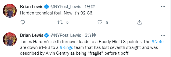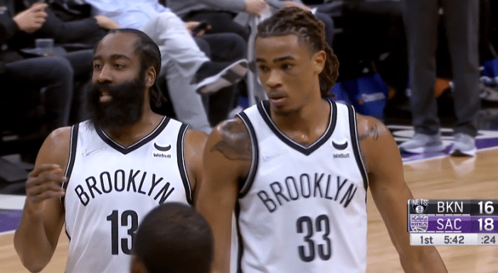 下半场,第三节巴恩斯带领国王反扑,哈登和欧文同时带队却都不得分,此时克拉克斯顿两次二次进攻得分,篮网打停国王,暂停回来约翰逊和格里芬先后得分,国王回应三分,哈登又失误,格里芬2+1稳住局面,国王继续反扑,三节打完篮网仅领先3分,哈登单节又是0分,3篮板3助攻却有4次失误。