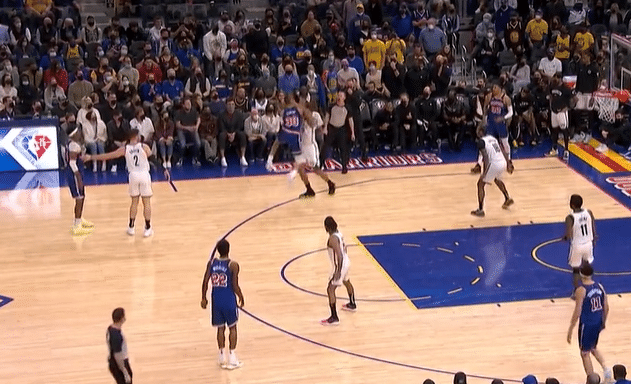 其实这个球库里在考上前的时候,就想到了出手出手三分球,很有可能不被吹三分球犯规,所以他选择了从投篮变成了传球的动作,意图是希望可以捞到犯规罚球的机会。