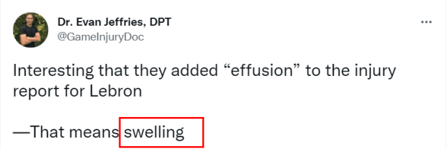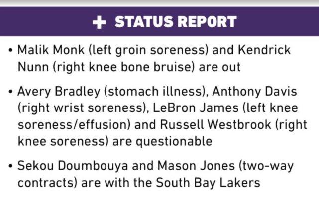 詹姆斯左膝酸痛,官方更新还有“积液”,医学专家Evan解释说那代表膝盖出现肿胀。浓眉右手腕酸痛,他在昨天对76人的比赛中弄伤了手腕,带伤打完整场比赛。威少出现右膝酸痛,布拉德利胃病。湖人的四大主力竟然都进入伤病名单。