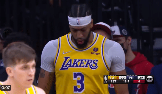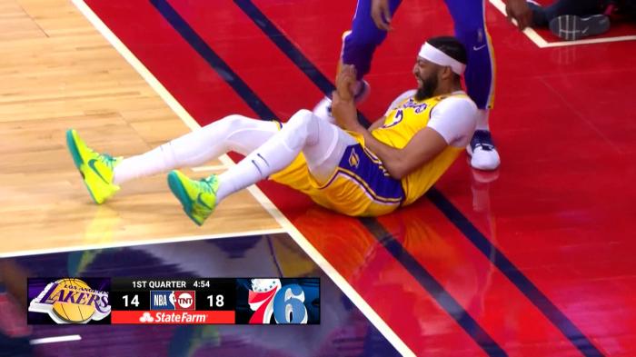 在一次进攻时,浓眉强突恩比德杀到禁区上篮,落地时摔伤手腕,当时浓眉坐在地板上捂着手腕十分痛苦,之后站起来,貌似伤势无大碍,带伤打了将近2分钟,浓眉被换下场;之后浓眉返回更衣室,检查手腕伤势,之后浓眉坐回替补席,伤势应该无碍。