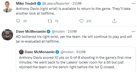 浓眉手腕受伤离场,湖人太不幸!绑上绷带坐回替补席,中场再次评估
