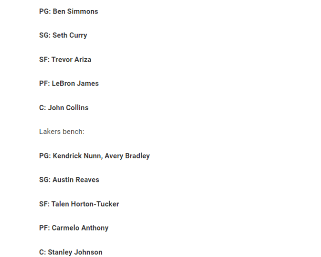 这样一笔交易后,湖人的首发可以调整为西蒙斯、塞斯-库里、阿里扎、詹姆斯和约翰-科林斯;替补是纳恩、里夫斯、塔克、安东尼和斯坦利-约翰逊。