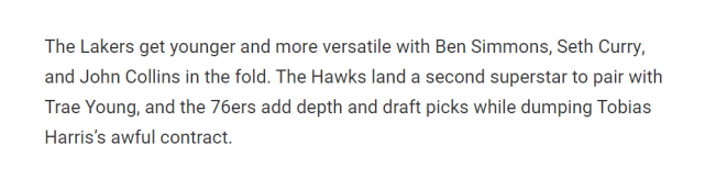 湖人得到本-西蒙斯、约翰-科林斯、塞斯-库里、路威和2023年首轮(来自76人)